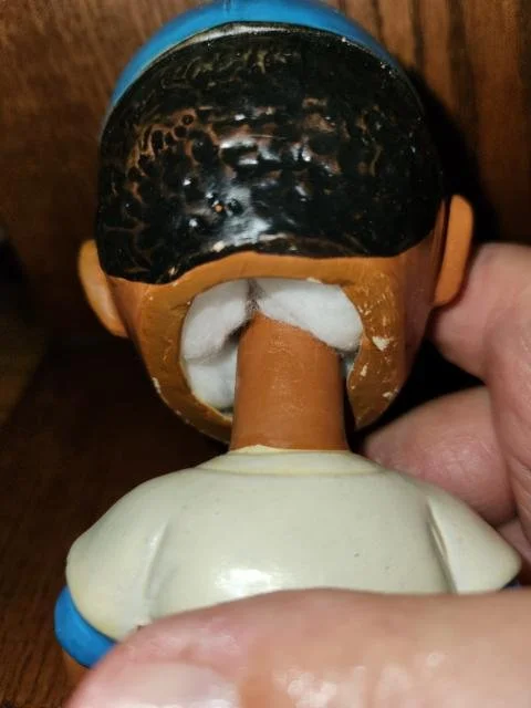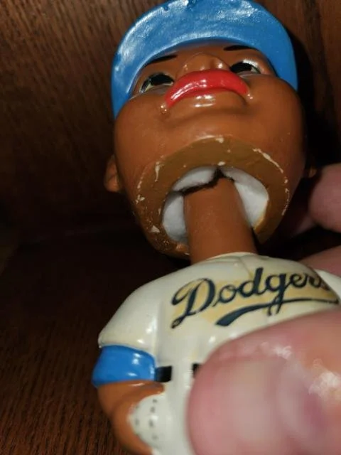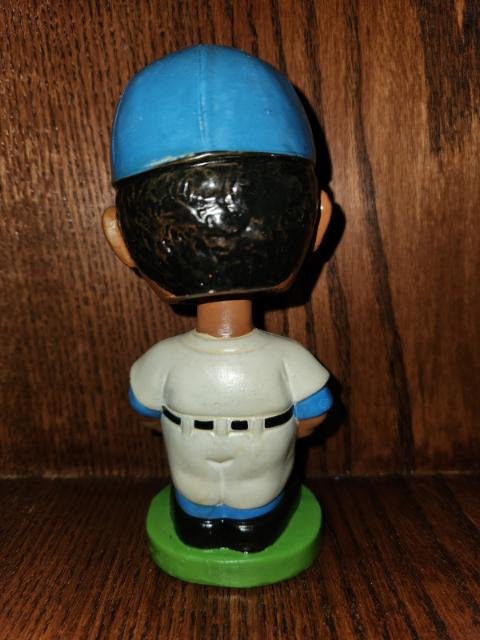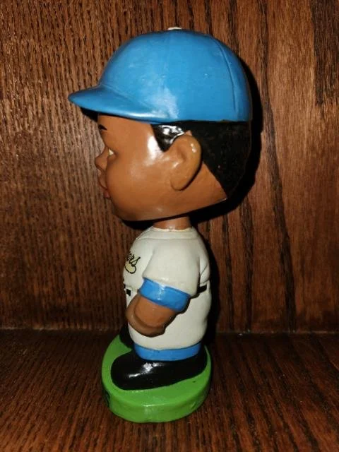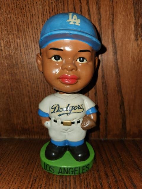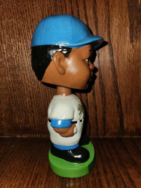 This listing is for the Los Angeles Dodgers Black Faced Nodder. He was made in 1963, is part of the Black Face set, stands 7 inches tall, and is the Serious Face as opposed to the Happy Face. His colors are bright and appealing, and he displays very nicely. I guarantee this doll to be 95% original and in absolute mint condition. The rim of his head has had a touch up dab of paint, for some reason or another? All else is original. CentralPaNodders.com and NodderKing.com appreciate your interest and hope that you make us part of your regular daily stops as we are constantly adding new and exciting pieces.